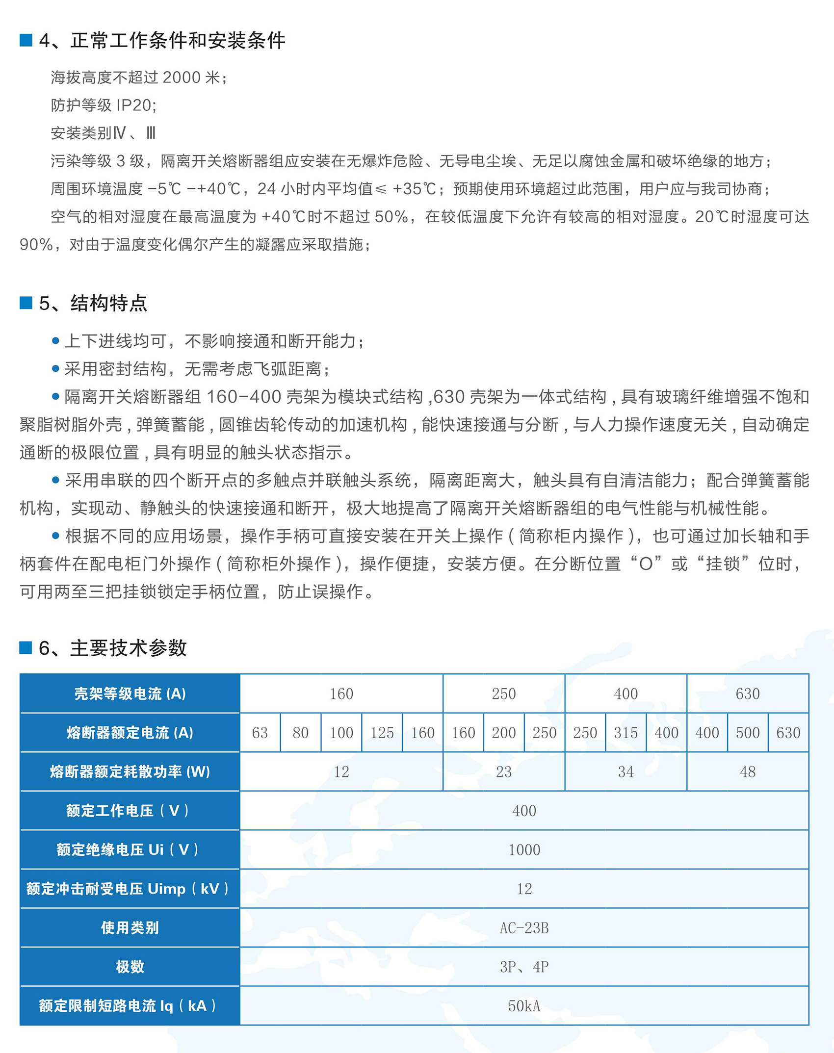 BKGR1系列隔离开关熔断器组适用于交流50Hz,额定工作电压为AC400V,额定工作电流63A-630A的低压配电或电动机网络中,作为不频繁接通、分断电路及线路的隔离之用。可提供短路、过载?;すδ堋KGR1系列隔离开关熔断器组符合GB/T 14048.3《低压开关设备和控制设备低压开关、隔离器、隔离开关及熔断器组合电器》。