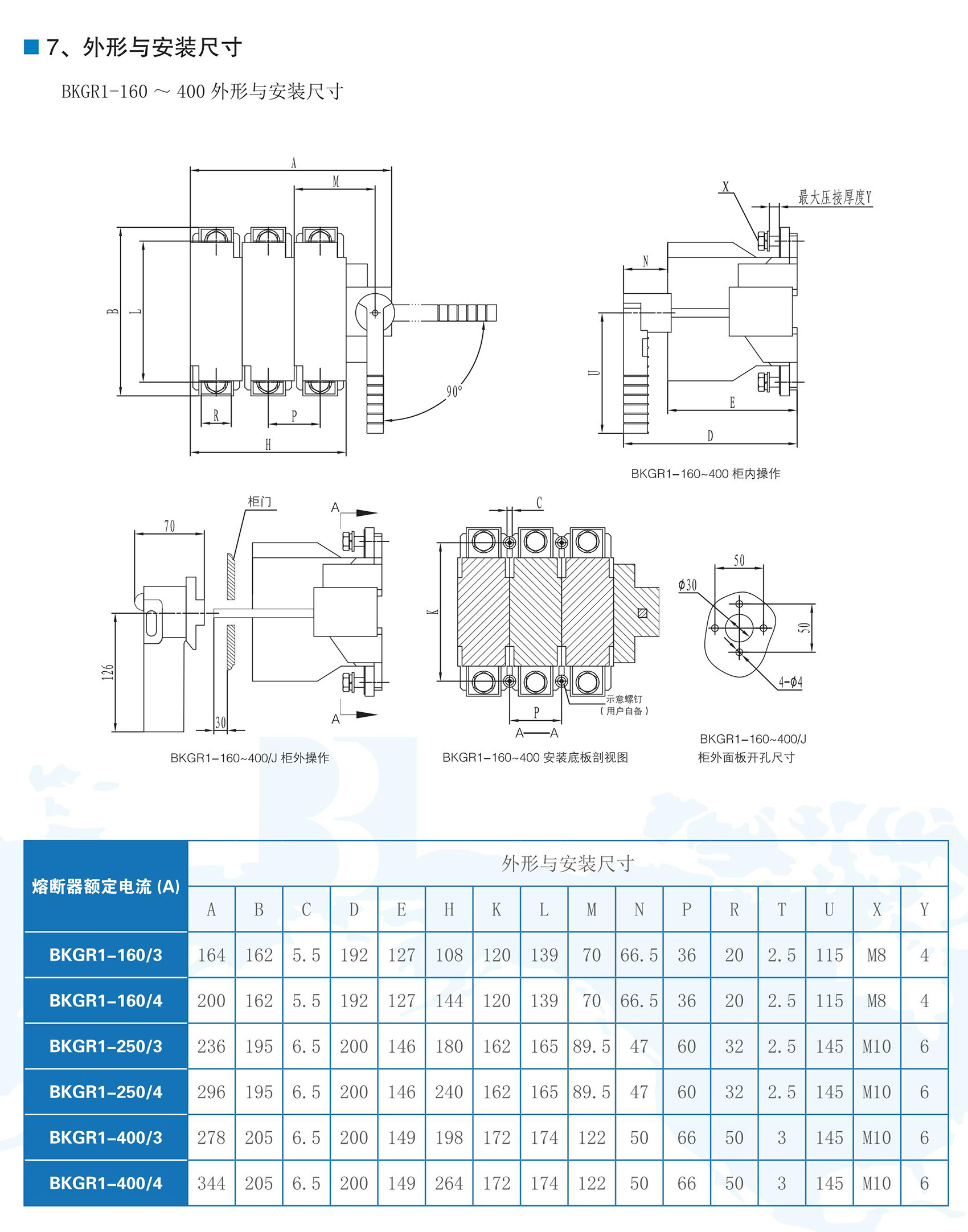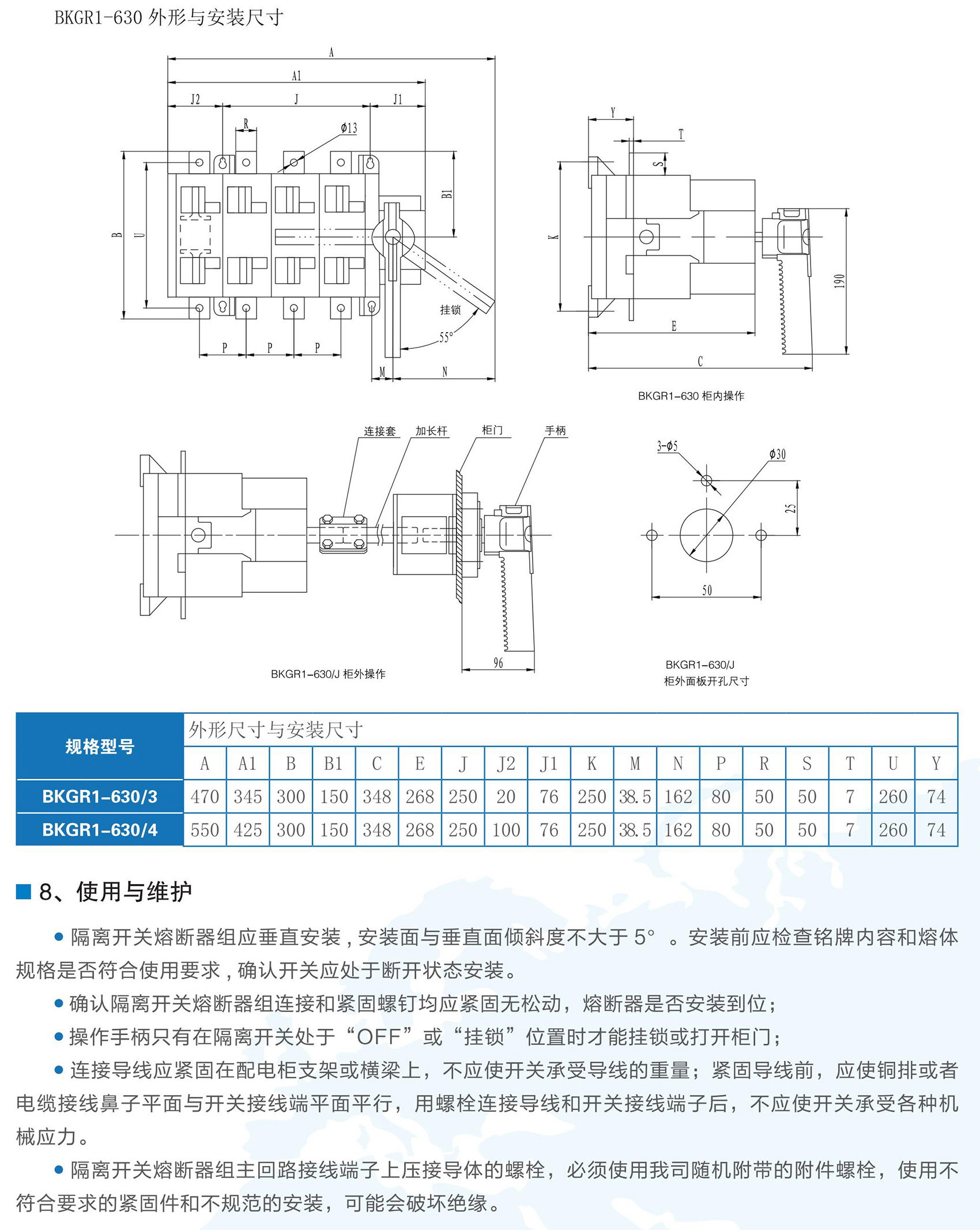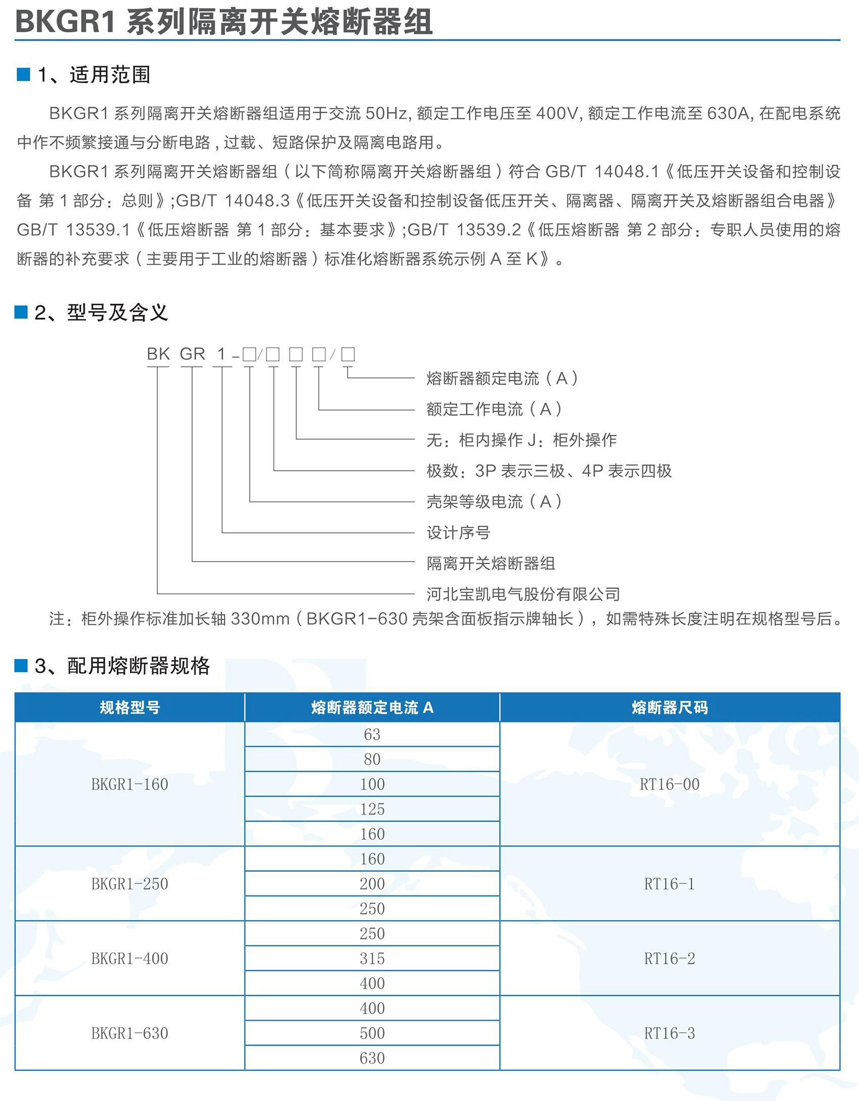BKGR1系列隔离开关熔断器组适用于交流50Hz,额定工作电压为AC400V,额定工作电流63A-630A的低压配电或电动机网络中,作为不频繁接通、分断电路及线路的隔离之用。可提供短路、过载?;すδ堋KGR1系列隔离开关熔断器组符合GB/T 14048.3《低压开关设备和控制设备低压开关、隔离器、隔离开关及熔断器组合电器》。